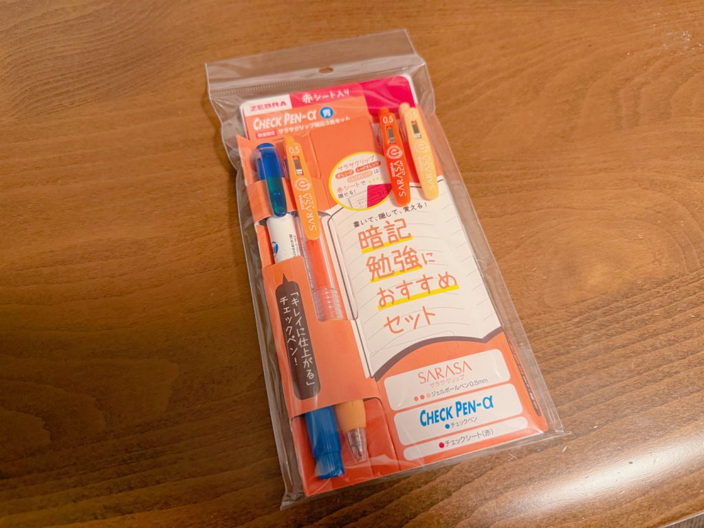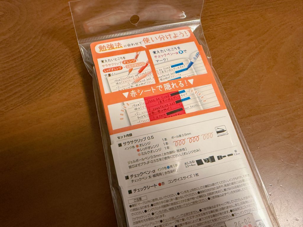 ノートに書いて覚えたい時は、3色入っているオレンジの「サラサクリップ」で書き込み
